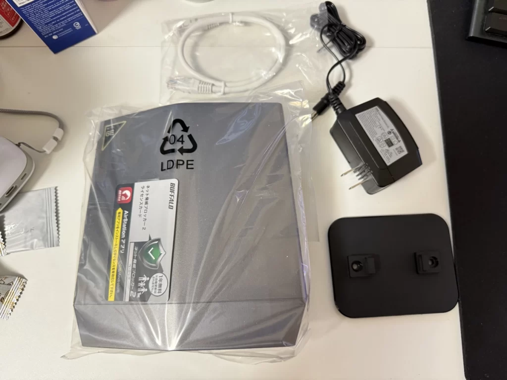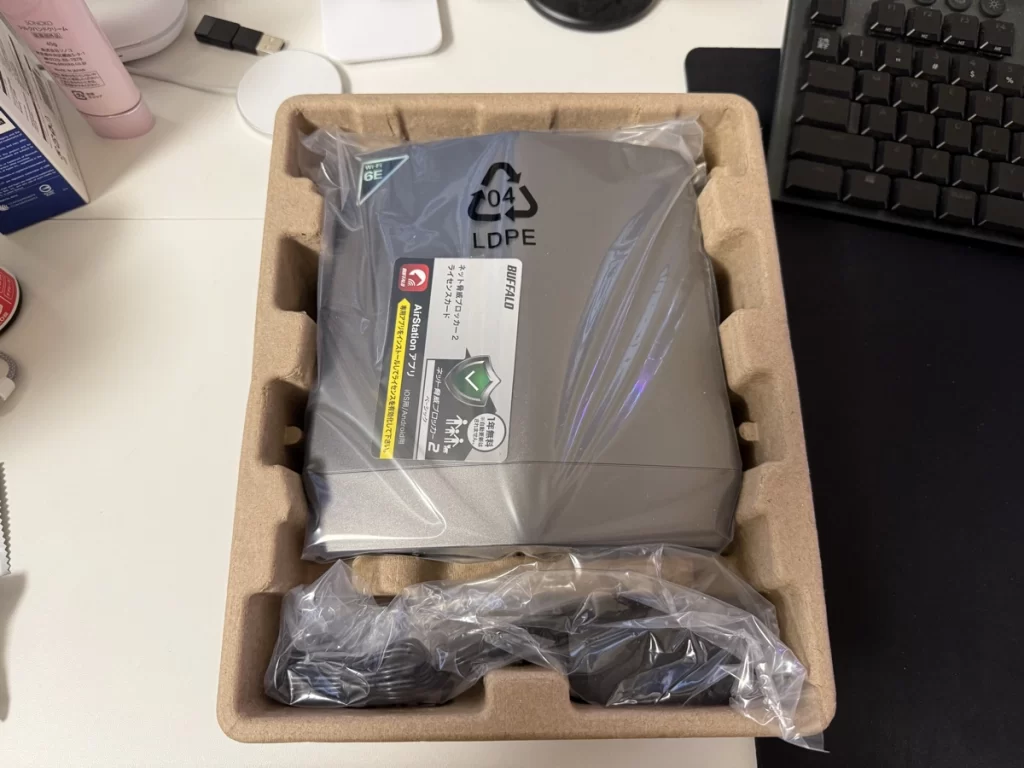 私にとってバッファローは約10年ぶりでした。正直を言うと、昔の印象は“ちょっと不安定で設定が分かりづらい”というネガ寄り。ただ、Wi-Fi 6/6E世代になって各社かなり良くなってきているのも知っていたので、先入観をいったん捨ててこのモデルを迎え入れました。値段は2万円弱のレンジ。ゲームも配信もいける“はず”の器という期待を持って、いざ開封。