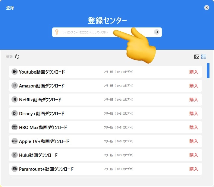 製品を登録するには矢印のところを押してライセンスキーを入力してください。