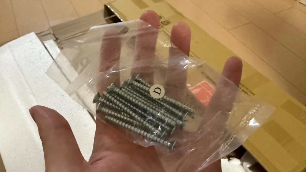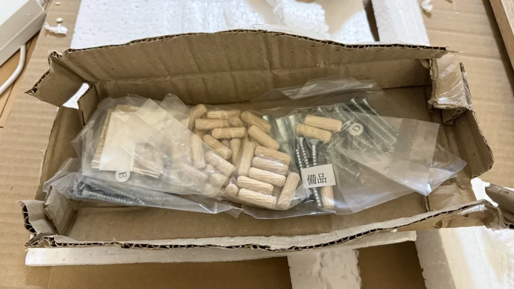 まずは同梱物を全展開して確認。ネジやダボは袋ごとにラベリングされ、説明書の図と照合しやすいです。