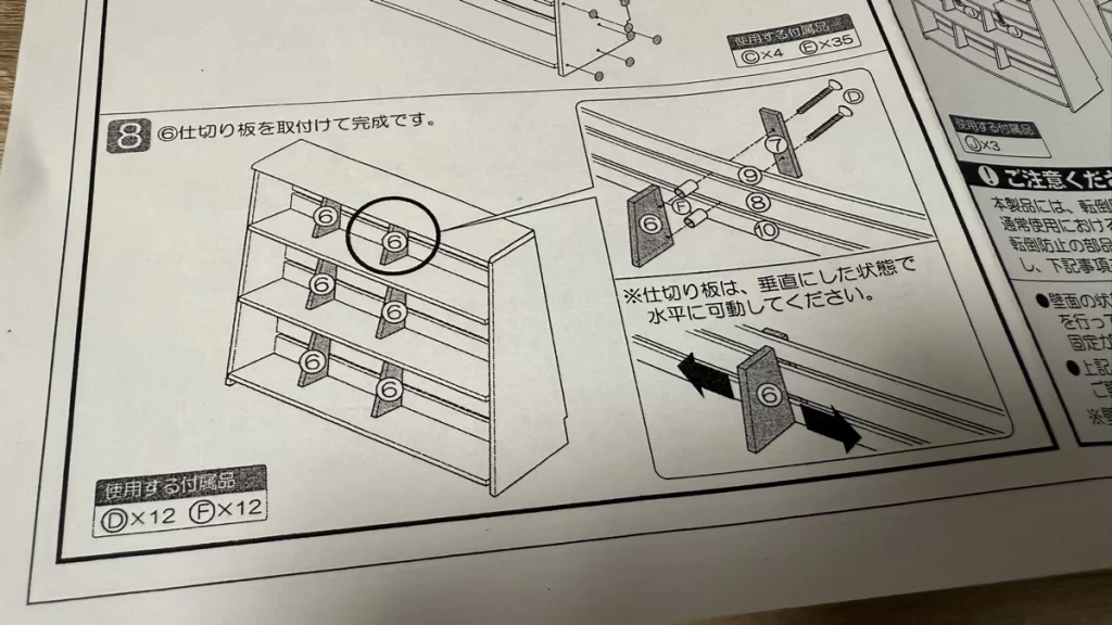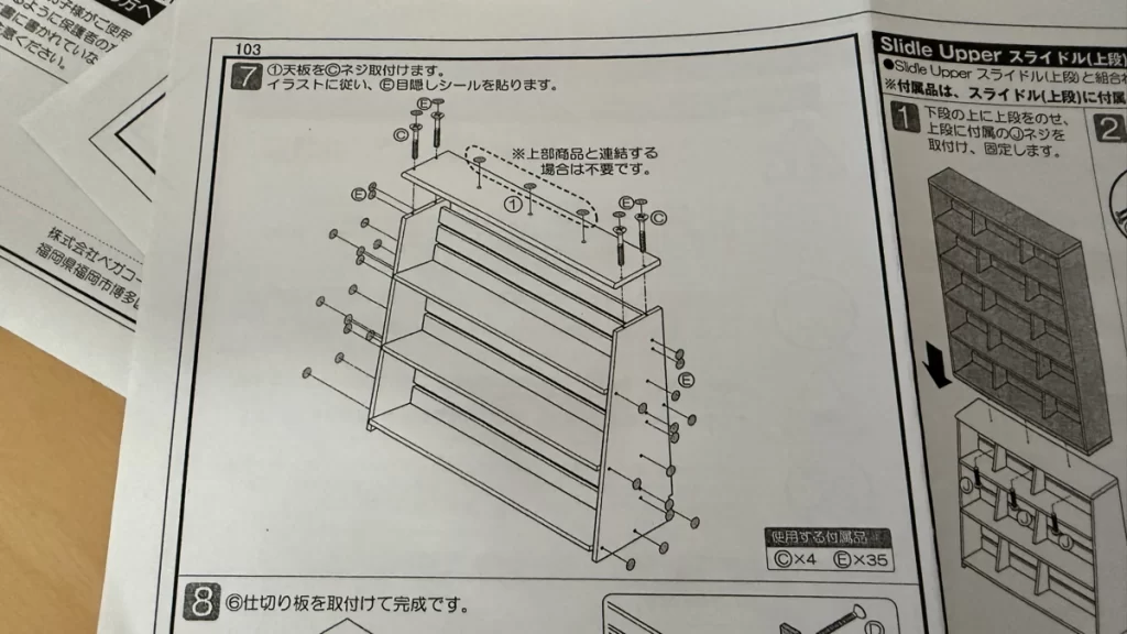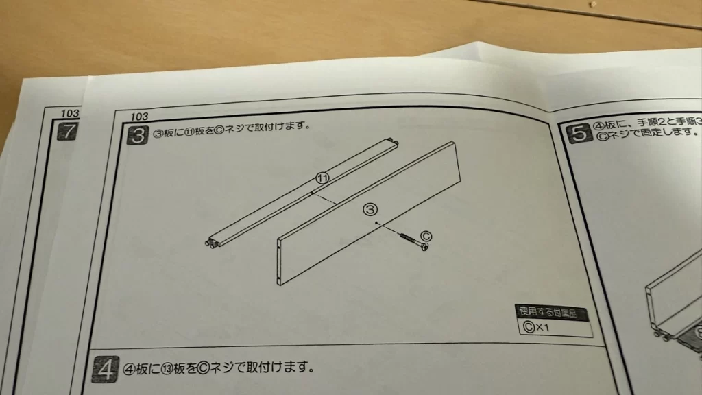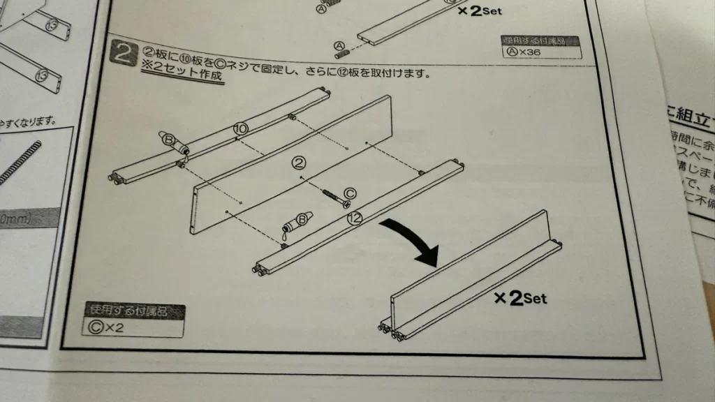 次に、レール板や棚ユニットを順に固定。説明書は手順ごとに要点が整理されていて迷いにくいです。