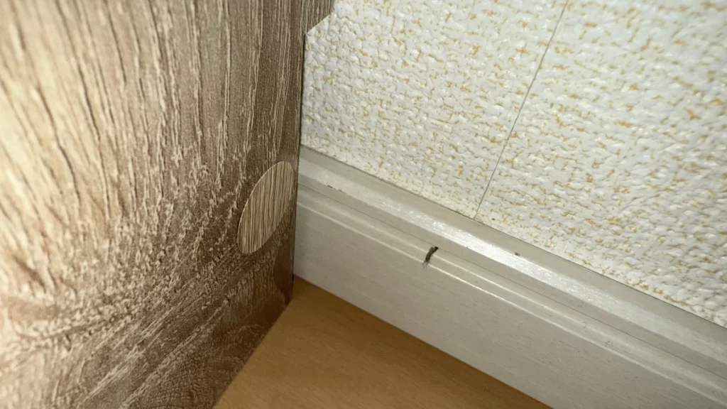 奥行きが控えめで、巾木よけの切り欠きがあるから壁にビタッと寄せられる。この“壁ピタ”は狭い部屋では特に効きます(設置後の後述画像参照)。色はオークを選択。白壁の部屋でも重くならない、柔らかい木目プリントで安心しました。