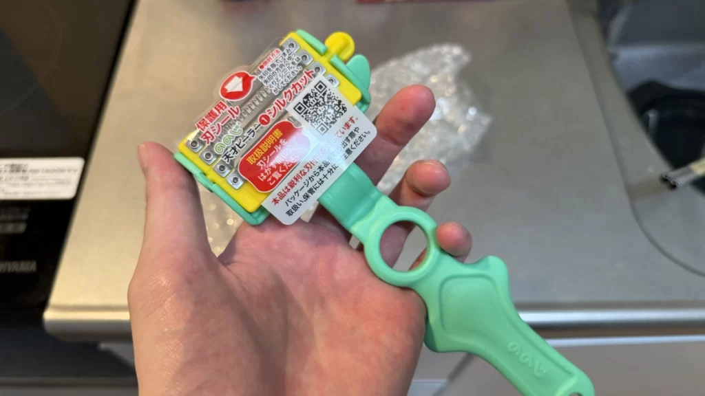 刃の部分は4枚刃が並ぶ独特な構造で、初見だと少し驚きます。刃には怪我防止用のシールが貼られており、簡単に剥がせました。